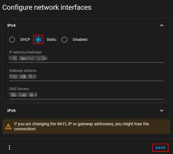 - If you were using a static IP, head to Settings > System > Network and under Configure network interfaces select IPv4. Now select Static and configure the same IP details as on your old HA instance the click Save.