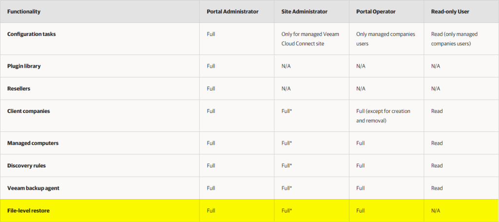 Restore capabilities use RBAC, designed to be available right across VSPC whether you are a company, reseller or admin portal user. The tables below show which roles portal users will need in order to perform file-level restores.
