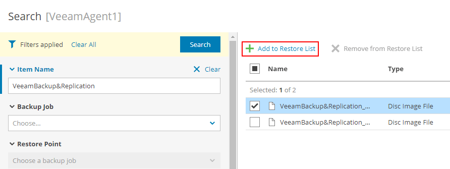 By default, the search will return items across all available restore points if none of the filters are specified. Files that are available in multiple restore points will only show the latest restore point.