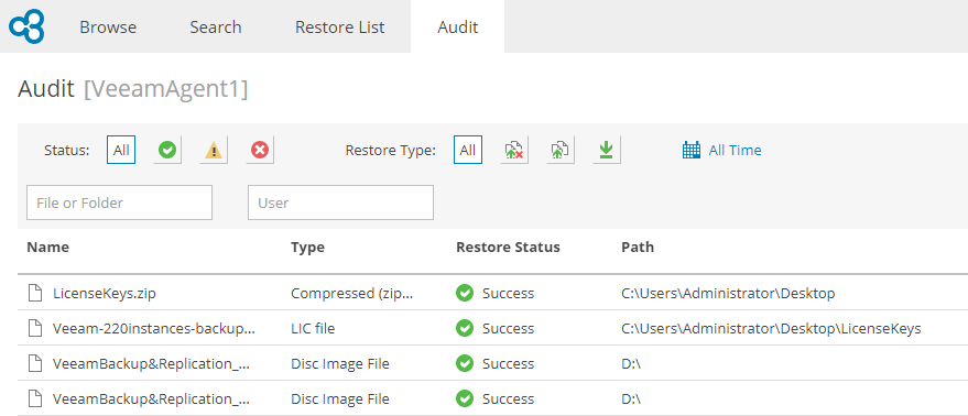 Earlier on I mentioned the ability to look at restore job results. Let’s go over that now by heading to the Audit tab. You can think of this as a historic view of any type of file-level restore that has ran and a way to determine whether a particular object was restored successfully or not.