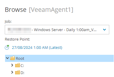 We’ll start with the Browse tab which is where you will be directed to by default when the restore portal opens. The first step is to select which backup job to restore from the dropdown box (if the computer has more than 1 job) followed by which restore point to use by clicking Select.
