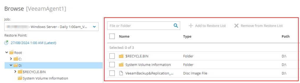 Selecting files and folders for restore can be achieved by browsing the folder structure in the tree view and selecting a folder. This will display the files and folders within the selected folder in the window to the right.