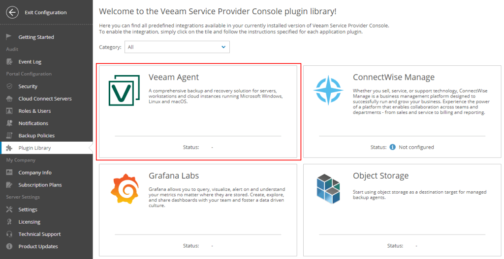 The first step before we can start restoring anything is to enable the feature since it is turned off by default. To do so, log into VSPC as a Portal Administrator and head over Configuration > Plugin Library and click on the Veeam Agent tile.