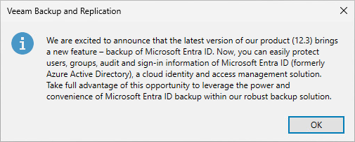 Once upgraded to 12.3 you will get a popup relating to Entra ID support when opening the Backup & Replication console for the first time.