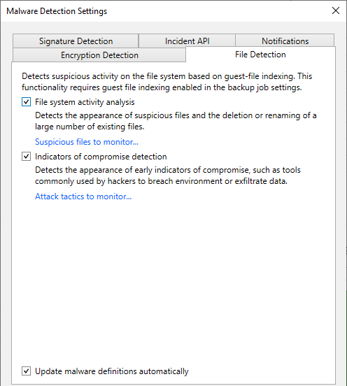 The IoC detections are based off the MITRE ATT&CK Matrix – a globally-accessible knowledge base of adversary tactics and techniques. The actual list of the different tools Veeam is monitoring for is extensive! You can look through the whole list yourself by going to Malware Detection Settings > File Detection tab then clicking on the Attach tactics to monitor link. This is also the area where tools can be excluded from monitoring.