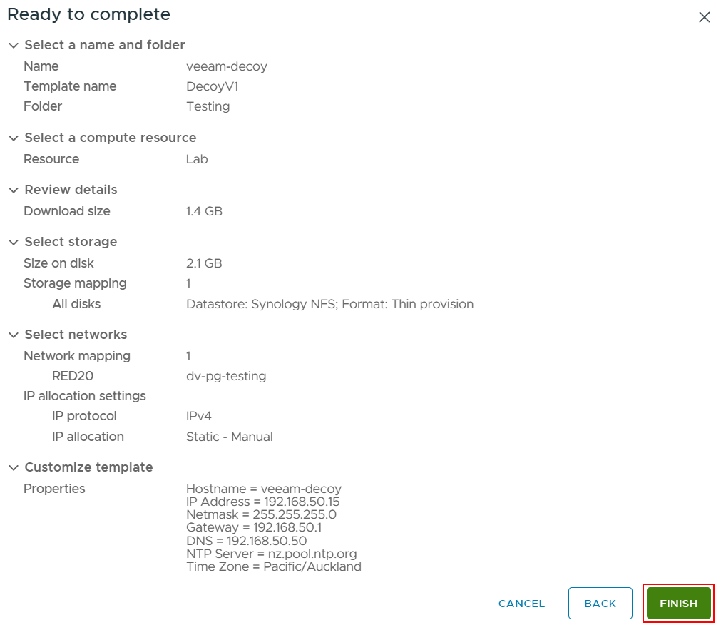 Check all the settings are correct and click Finish to start deployment.