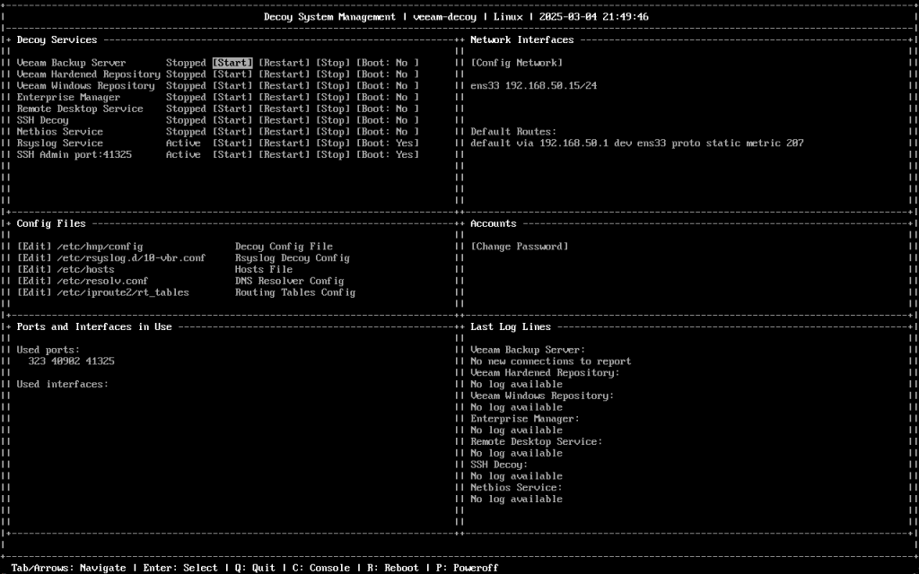 | Ports and Interfaces in Use | Shows used ports and network interfaces for active decoy services. |