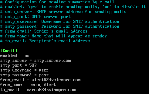 The first method uses SMTP to send an e-mail every 5 minutes if there are connections to any of the active decoy services. This is easy to setup and configure within the Decoy config file.