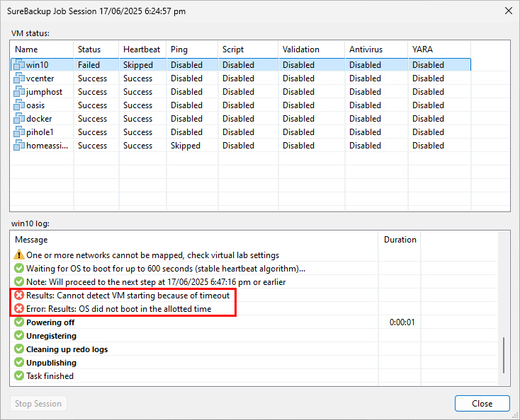 Day to day, SureBackup typically hums along in the background with very little overhead. But as is life, there are times where something unexpected happens causing the job to fail. Veeam does a good job at providing clear error messages in the UI to help with the troubleshooting process however, there is one error message in particular that I find raises more questions than answers.