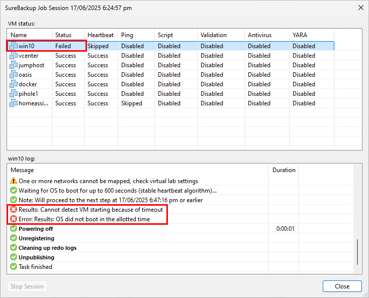 This error occurs when a server in the job fails to produce a heartbeat within in the allotted startup time. The main issue with the error message is that it provides no insight as to why a heartbeat wasn’t received. I completely acknowledge the fact that Veeam has no way of knowing what is going on under the hood of a VM from the OS layer, however it doesn’t make it any easier to troubleshoot!