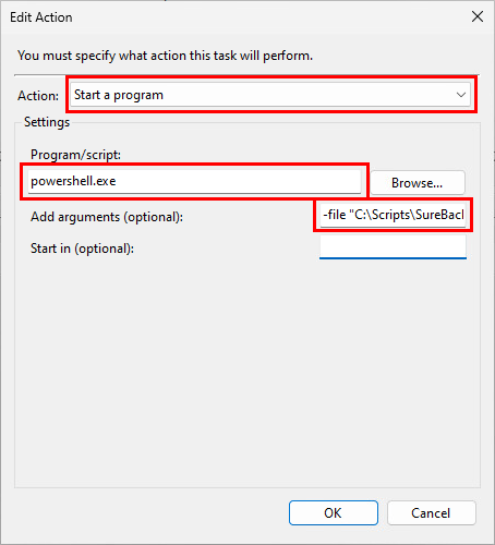 powershell.exe is fairly self-explanatory – we are telling the scheduled task to start a PowerShell session when triggered. Next we are providing 2 arguments: