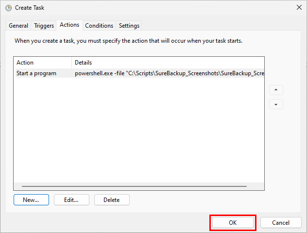 On the Actions tab click New, ensuring Action is set to Start a program. In the Program/script text field enter powershell.exe. In the Add arguments text field enter: