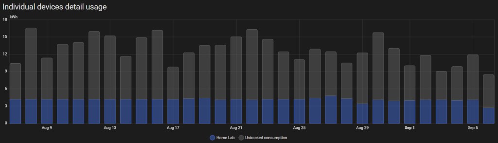 Considering all the hardware in my lab runs 24/7, I’m quite pleased with how little power gets consumed. With an average 4 kWh draw per day, running costs work out at just over $30 per month.