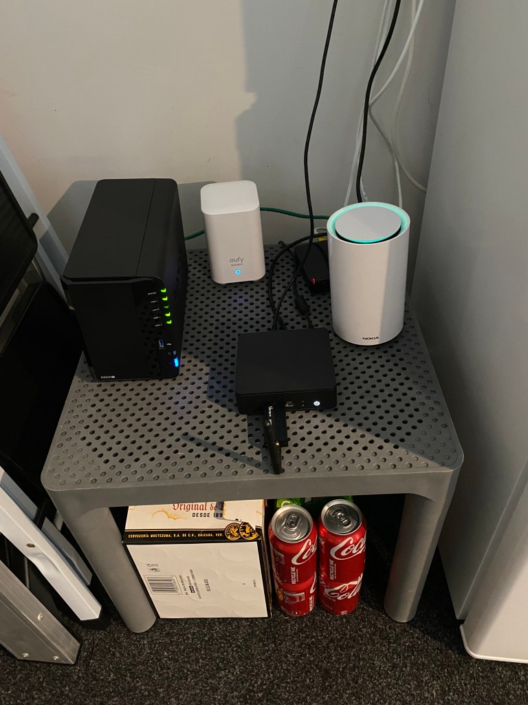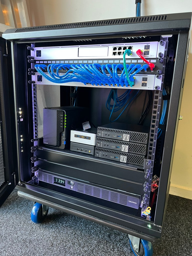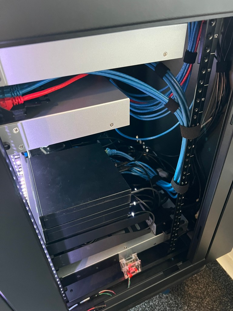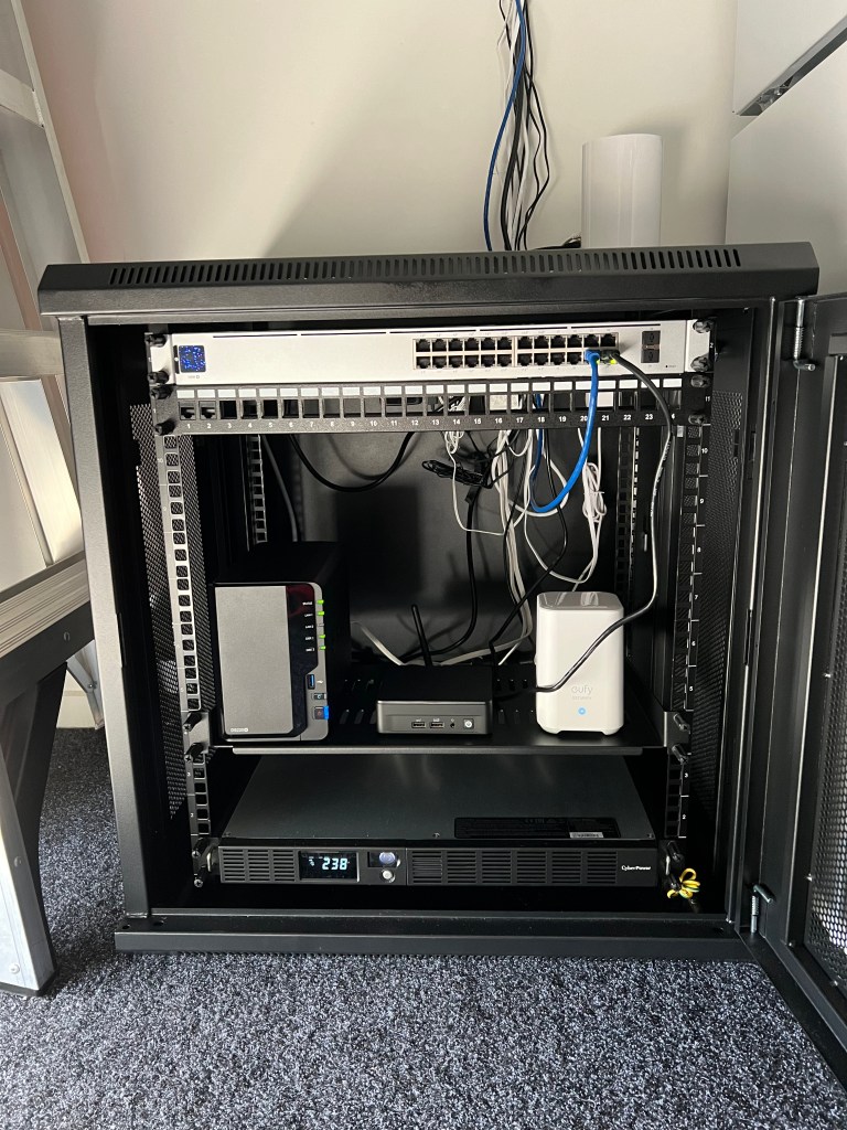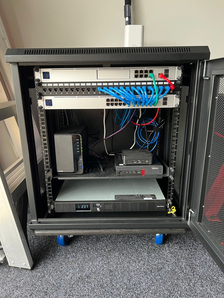 Shortly after moving house a few years ago the home lab was swiftly relocated demoted to it’s permantent home, the garage. Suprisingly this did have some upsides though – being located next to the cabinet containing the ONT means the internet stays online if there is a power outage thanks to the UPS.