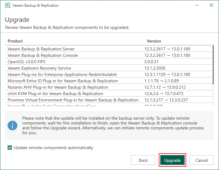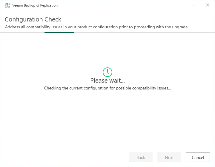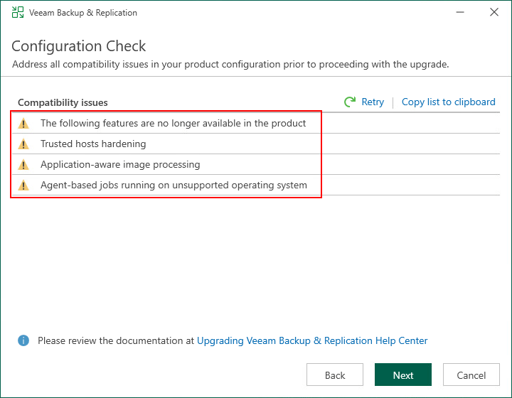 If warning or information messages are shown, hover the mouse over each to see details about the message. While it is possible to continue the upgrade and address the issues later, Veeam recommends these are resolved prior to upgrading to prevent it potentially leading to a more serious problem later on.