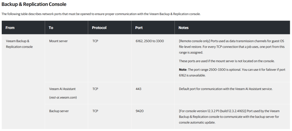 Another thing I noticed while reading the pre-requisites is a change to the ports used by the console. TCP port 9392 is missing from the table below which has been used for communication between the console and the VBR server for many years. Starting from V13, connections from the console and the web client to the backup server use TCP 443.